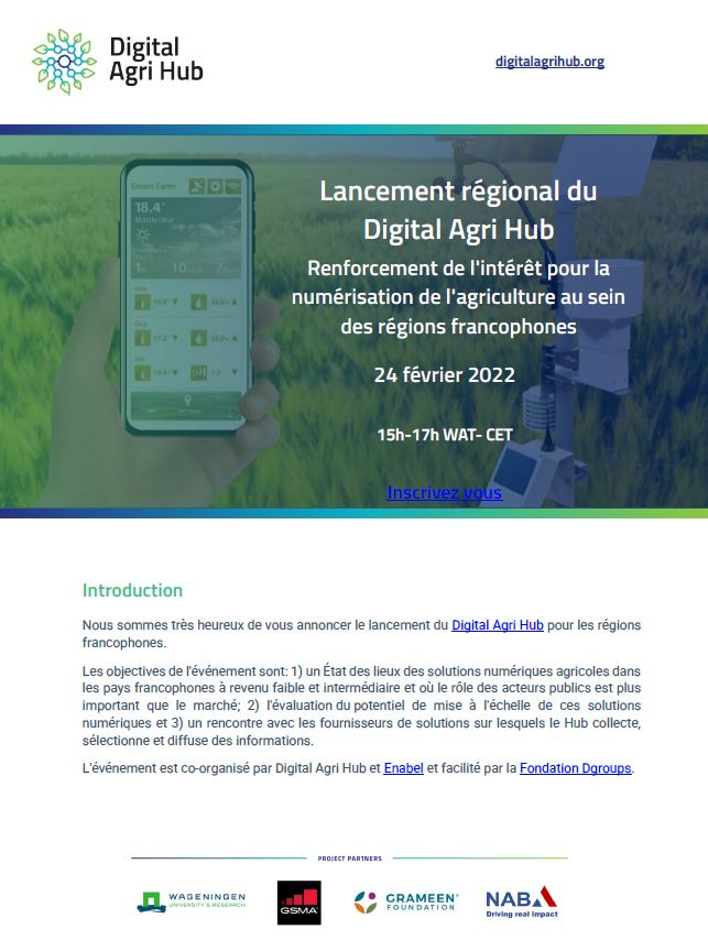 The event will explore the status and potential for scaling digital solutions for agriculture in francophone low- and middle-income countries , where the market is relatively weak compared to the role of public actors. It will also be the opportunity to learn more on solution providers in the region that the Hub is collecting, curating and disseminating information on.